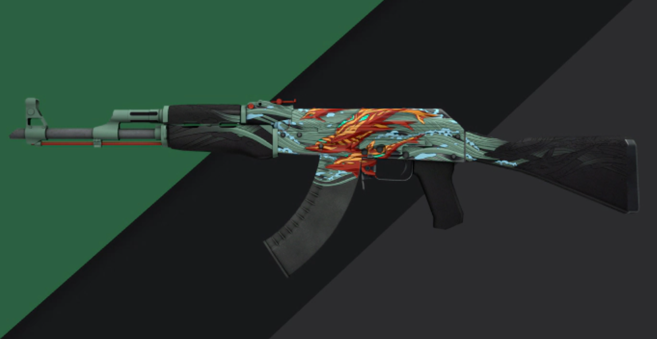 Aquamarine Revenge showcases a dynamic wave scene populated with energetic aquatic creatures moving across the rifle in a fluid dance. Bright teals and seafoam greens blend effortlessly with fiery orange accents, creating a contrast that symbolises harmony and chaos. The design has a sense of motion, making it feel as though the AK is slicing through water with every movement. The visual storytelling is clever — playful yet aggressive — making this skin a favourite for those who appreciate colour theory and thematic consistency.