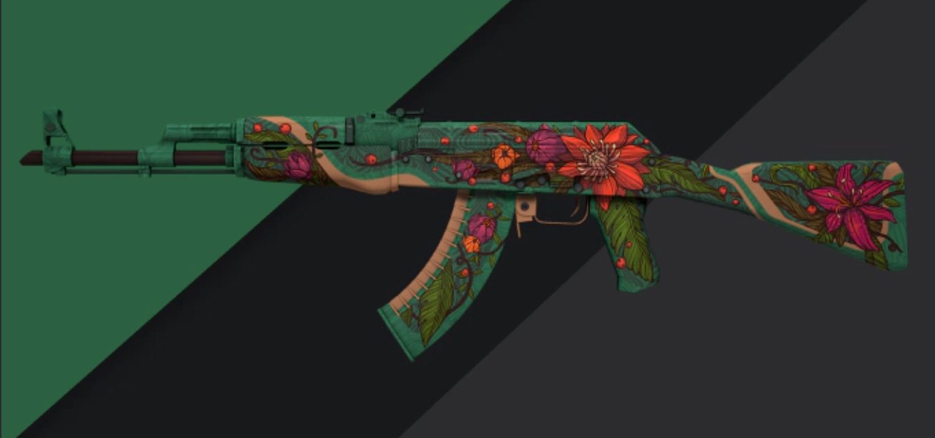 Wild Lotus is serenity painted onto a rifle built for chaos. Soft floral patterns bloom across a rich green base, blending nature and warfare in a striking contrast. The orange and pink lotus blossoms are bright, delicate, and symbolic of purity and renewal — unusual themes for a weapon but breathtaking nonetheless. Its rarity elevates it to near-mythical status among collectors.