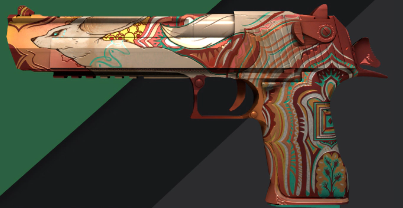 The Fennec Fox design blends charm and deadliness. Its warm desert palette of beige, amber, and gold fits beautifully with the fox imagery — sharp, clever, and fierce. The artistic strokes give the design a hand-painted feel, making it stand out from louder, more chaotic Deagle skins.