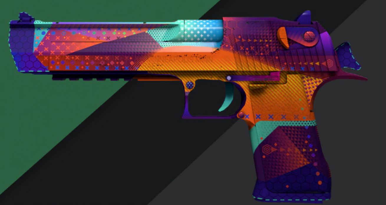 The Desert Eagle | Ocean Drive is pure visual energy. A kaleidoscope of colour bursts across every panel of the pistol, mixing neon pink, aqua, purple, teal, and warm yellow in a chaotic but intentional pattern. The jagged geometric overlay resembles high-end graffiti or underground club poster art, giving it a rebellious, nightlife-inspired personality. In motion, the skin becomes even more dramatic — the reflective coat and layered contrasts work perfectly with CS2’s lighting engine. This is a skin for players who want their sidearm to stand out louder than any rifle in the room.