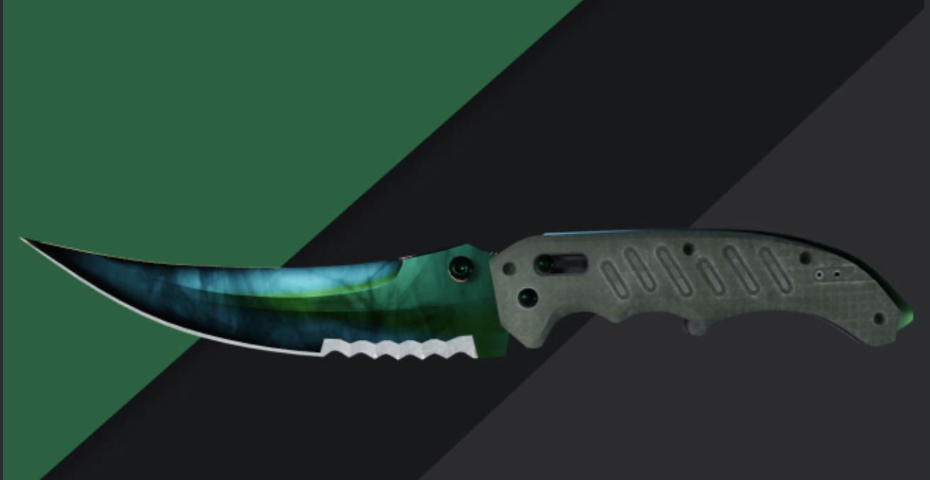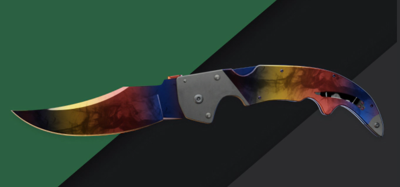 A swirling dance of red, blue, yellow, and purple blends across this knife’s blade, making it one of the most colourful melee skins in the entire game. The glossy coat enhances the marble-like texture, giving it a toy-like playful essence while still feeling premium. The Fade gradients change dynamically as the blade rotates, giving it outstanding visual movement.